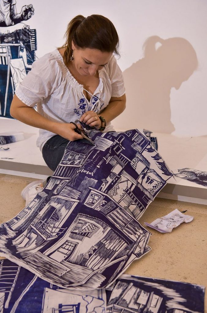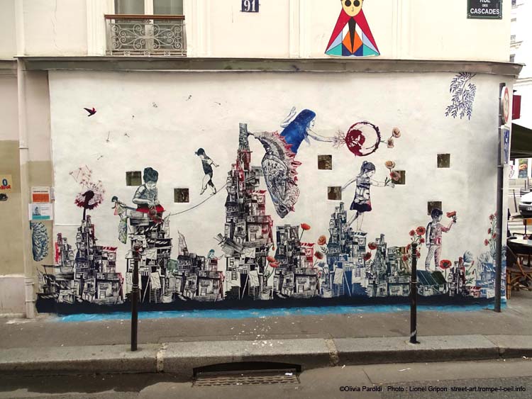 C’est ainsi qu’elle décide, il y a une dizaine d’année, de propulser la gravure hors de son cadre habituel et de coller ses estampes dans les rues. Pour réaliser ses œuvres d’art urbain, Olivia Paroldi commence par réaliser une gravure, minutieusement, avec son approche tout en douceur, en tendresse. Puis, par une technique traditionnelle de sérigraphie, elle imprime ensuite ses estampes sur papier qu’elle collera enfin sur les murs de nos villes pour leurs donner vie.
